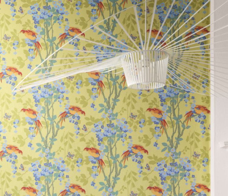 Loriine behang van Little Greene. Een op het oppervlak gedrukt ontwerp met exotische Lory-vogels en oosterse bloesem, geïnspireerd op een charismatisch stuk uit de 20e eeuw dat in het bezit is van de Whitworth Art Gallery in Manchester. Het exotische onderwerp en de bijna symmetrische herhaling zijn typerend voor ontwerpen uit de jaren dertig en weerspiegelen de ambities van reizen naar verre landen en een show van rijkdom voor bezoekers van het huis. Hoewel ze opnieuw zijn gekleurd voor het huis van vandaag, getuigen de geselecteerde kleuren van het gebruik van felle kleuren, gemeengoed in de jaren 1930, en de Lory kan alleen al om deze reden als onderwerp zijn gekozen! Verkrijgbaar in vijf kleurstellingen.Â