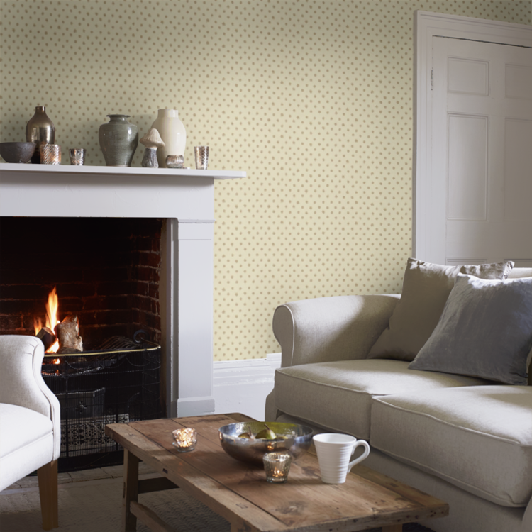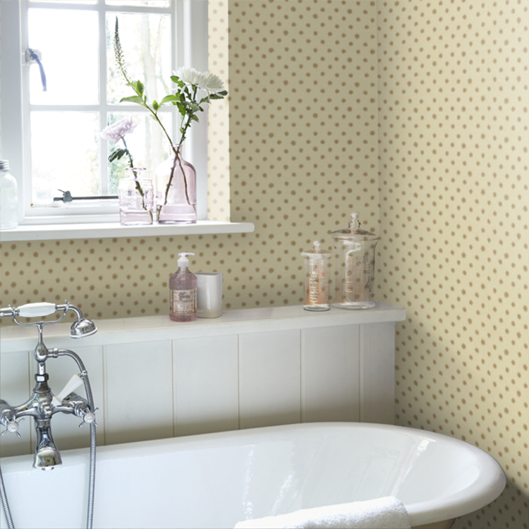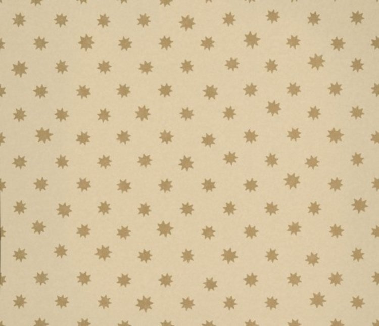 Een abstract behang dat ondanks zijn eigentijdse uitstraling waarschijnlijk dateert uit het begin van de 19e eeuw. Dergelijke ontwerpen waren destijds enorm populair. Het originele kleurenschema, met oranje sterren op een roze achtergrond, werd ontdekt op een bovenverdieping van een commercieel gebouw. Dit gebouw is in het begin van de 19e eeuw gerenoveerd, maar was waarschijnlijk veel ouder.