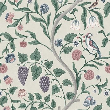 Dit levensboomontwerp is rechtstreeks afkomstig van de leren wandbekleding in de eetkamer van Bateman’s, een Jacobijns herenhuis in East Sussex. Gedetailleerde ontwerpen, zoals deze, waren geïnspireerd op 17e-eeuwse Indiase sits, die vaak kronkelige bloeiende bomen met vogels tussen de takken afbeeldden.