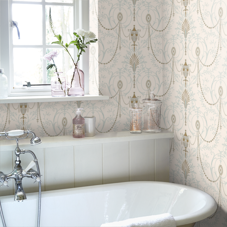 Een grootschalig patroon, dat doet denken aan een vroege 20e-eeuwse interpretatie van een ontwerp van Robert Adam. Dit behang werd ontdekt kort na de dood van Queen Mary, die tot 1953 in Marlborough House woonde. Het huis werd toen het hoofdkwartier van het Commonwealth-secretariaat.