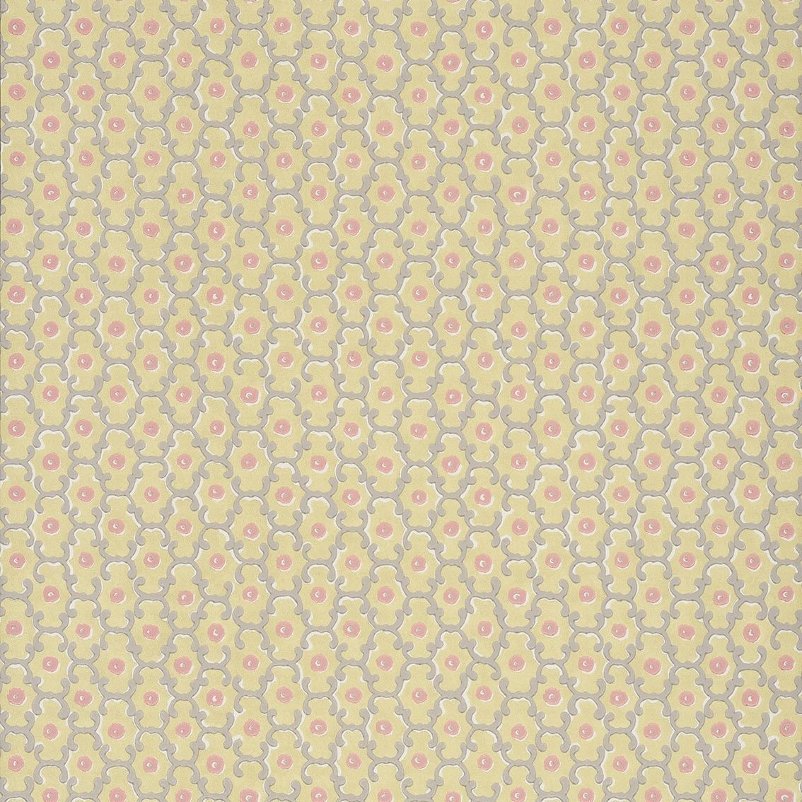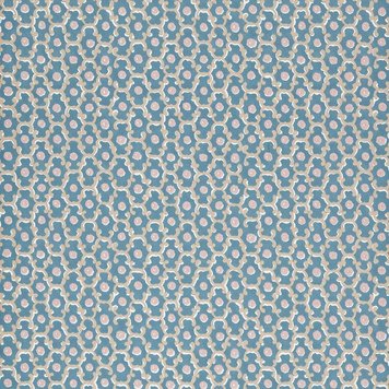 Moy behang van Little Greene. Er is weinig bekend over deze kleinschalige prent die is gevonden in The Argory, net buiten Moy in Noord-Ierland. Het overgebleven fragment wordt geschat op het einde van de 19e eeuw en is gedrukt met verdunde aquarellen in plaats van een meer conventionele, substantiële inkt of zelfs dekkende verf. Dit enigszins gebroken effect, gecombineerd met de schaduwen die te zien zijn in het losse geometrische patroon, geeft het ontwerp een leven dat moeilijk rechtstreeks vanaf de tekentafel zou kunnen worden bereikt.