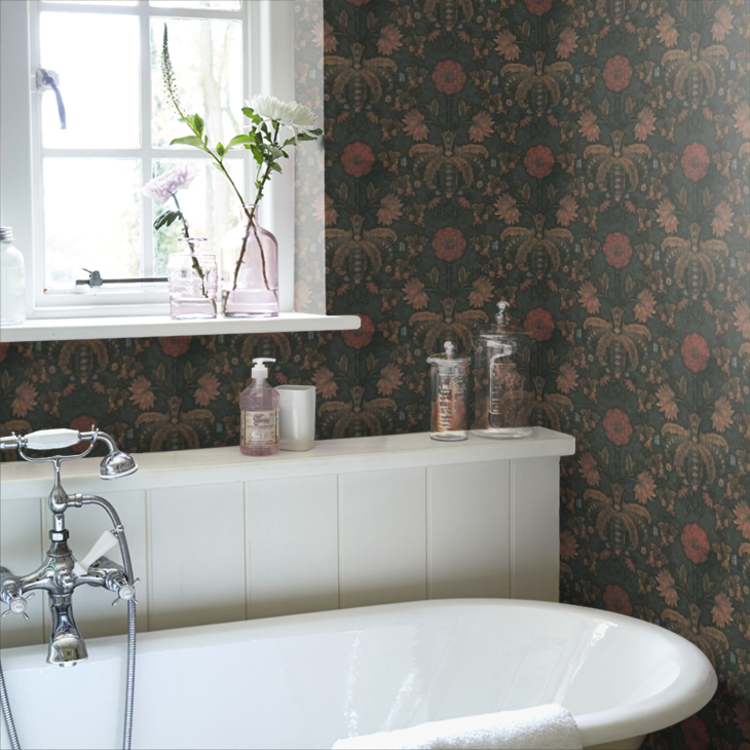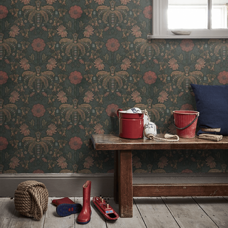 Dit fragment van een leren wandbekleding met reliëfprint is gebaseerd op een van de oudste documenten in het behangarchief English Heritage. Het dateert eigenlijk uit een tijd voordat behang bestond. De betreffende panelen waren van beschilderd leer, meestal met een bloemenreliëfmotief. Dit was een populaire, maar dure vorm van decoratie in de late 16e en 17e eeuw. De panelen werden aan elkaar genaaid om grootschalige, decoratieve wandbekleding te maken. Dit gebeurde op dezelfde manier, want behangstroken worden naast elkaar gehangen om een nog indrukwekkender statement te maken.