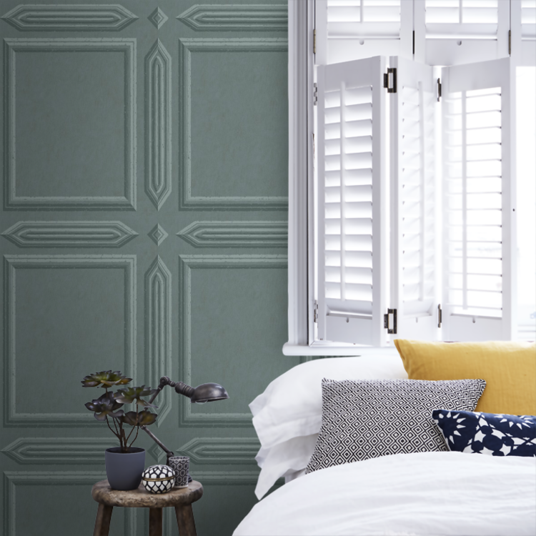 Elk afzonderlijk paneel binnen dit behangontwerp bevatte oorspronkelijk een overdadige voorstelling; een weerspiegeling van de vindplaats in Bloomsbury, een rijk gebied met een sprekende geschiedenis. Door de overbodige details achterwege te laten, blijft er een ongepolijst, maar elegant trompe l’oeil houtpaneeleffect over, dat op traditionele wijze kan worden aangebracht op alle wanden van een ruimte of, voor een tijdlozer en strakker effect, op een enkele wand in een moderner interieur.