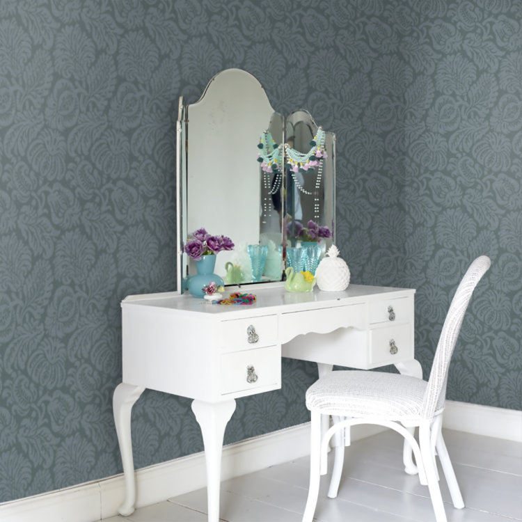 Een typisch historisch damast, waarvan de ontwerpbron oorspronkelijk een geweven zijde was uit de 19e eeuw. Dit effect wordt nu door de druktechniek nagebootst. Net als bij het ontwerp ‘High Street’ uit de collectie London Wallpapers III, zijn er van dit patroon drie voorbeelden bekend, afkomstig van meerdere locaties, wat het aannemelijk maakt dat het op vrij aanzienlijke schaal geproduceerd werd vanaf de 18e tot het einde van de 19e eeuw. Dit komt overeen met de productiemogelijkheden van de behangindustrie in die periode.