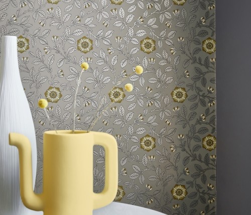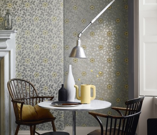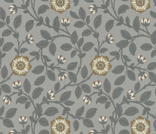 Het is wat oneerbiedig, gezien de kwaliteit van dit 19e eeuwse behang, maar het stukje behang dat gered kon worden, is niet afkomstig van de wanden van een chic herenhuis in Richmond, maar uit een container, die voor dit huis stond, toen het in 1989 verbouwd werd. Het ontwerp, met een tere Tudor-roos, is uitgevoerd in de William Morris stijl van de late 19e eeuw. Little Greene drukte het in twee authentieke Arts & Crafts kleuren, drie klassieke kleuren en een moderne metallic tint.
