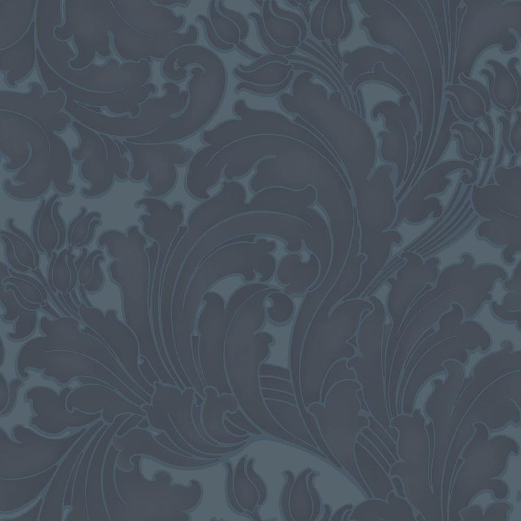 'Tulip' (Erddig) c.1898 Beschouwd als een van de mooiste landhuizen van Groot-Brittannië, Erddig, net buiten Wrexham in Noord-Wales, is de thuisbasis van een overvloedige collectie behangpapier. Sommige sieren nog steeds de muren van de staatskamers, maar er zijn er nog veel meer als monsters gevonden in theekisten op de zolderkamers. Aan het begin van de 20e eeuw werden ze verzameld door Philip en Louisa Yorke, die onlangs getrouwd waren en zich inzetten voor de herinrichting van Erddig, hun nieuwe familiehuis. Dit patroon van scrollend gebladerte is ongebruikelijk in zijn uitvoering; de gegradeerde kleur die de bladeren leven en diepte geeft, was, zelfs in 1898, een eigentijdse evolutie van het traditionele, platte damastontwerp.