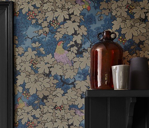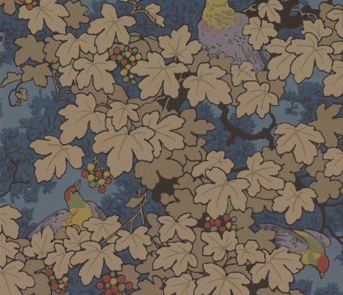 Vine (ca.1932), afkomstig uit het archief van de Whitworth Art Gallery in Manchester, biedt een onmiskenbare knipoog naar William Morris, de vader van de laat 19e-eeuwse Arts & Crafts-beweging. Er is een authentieke oppervlaktedruktechniek gebruikt om deze eigentijdse versie te reproduceren, waarbij de blauwe kleurstelling in kleur heel dicht bij het origineel ligt - ondanks de slechte staat van de achtergrondkleur op het overgebleven fragment.