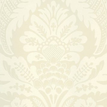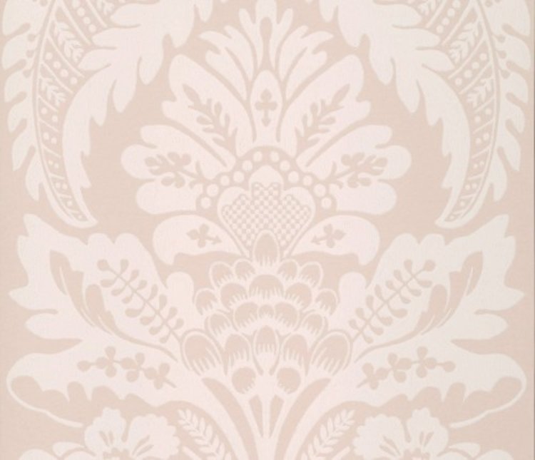 Een klassiek damastontwerp dat heel typerend is voor de populaire, grootschalige granaatappelpatronen uit het midden van de 18e eeuw. Dit zou oorspronkelijk een gevlokt behang zijn geweest dat in een groots Engels huis hing. Gevlokt behang was een Engelse specialiteit en in feite een imitatie van duur textiel. Toch was de productie van gevlokt behang duur. Dit was een overtuigend statement van luxe en sociale status.
