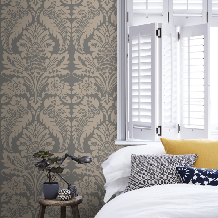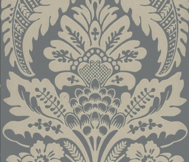 Een klassiek damastontwerp dat heel typerend is voor de populaire, grootschalige granaatappelpatronen uit het midden van de 18e eeuw. Dit zou oorspronkelijk een gevlokt behang zijn geweest dat in een groots Engels huis hing. Gevlokt behang was een Engelse specialiteit en in feite een imitatie van duur textiel. Toch was de productie van gevlokt behang duur. Dit was een overtuigend statement van luxe en sociale status.