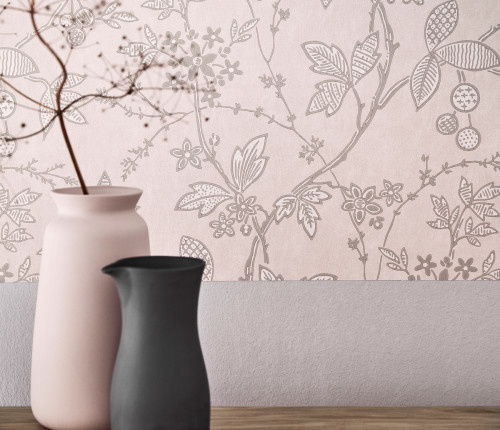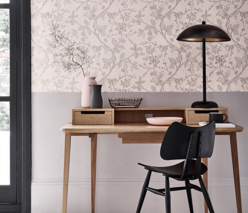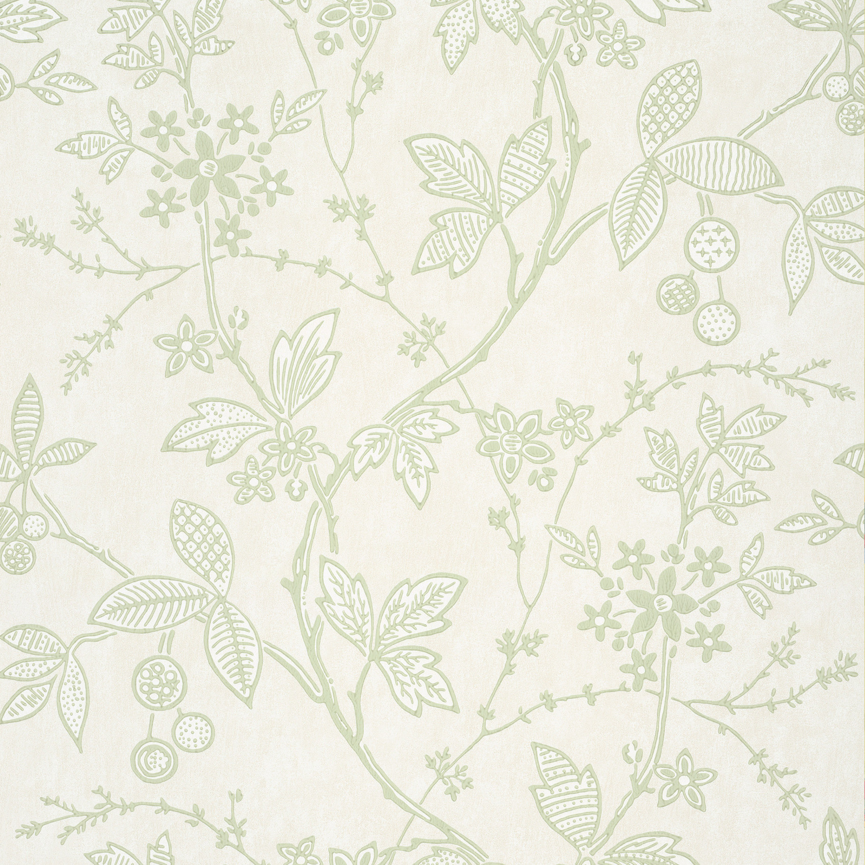 Wrest Trail behang van Little Greene. Dit ontwerp, afgeleid van een interessant stuk in het archief, is vooral opmerkelijk vanwege de tekenstijl die werd gebruikt om het all-over trail-effect te creëren. Een gestructureerde, dwalende stengel wordt gesierd door vrij ontspannen, bijna schetsachtige interpretaties van bladeren en fruit. In één oogopslag is het meer in stijl van het midden van de 20e eeuw dan zijn werkelijke oorsprong van honderd jaar eerder. Verkrijgbaar in vijf kleurstellingen.Â