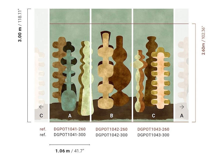 Let op: Dit paneel bestaat uit 3 banen. Deze banen zijn ieder 3 meter hoog en 106 centimeter breed. Samengevoegd is het paneel dus 3 meter hoog en 3,18 meter breed. Je maakt deze mural compleet door de 3 panelen met artikelcodes DGPOT1041, DGPOT1042 en DGPOT1043 te bestellen (zie afbeelding).