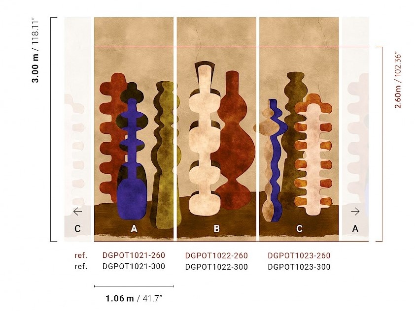 Let op: Dit paneel bestaat uit 3 banen. Deze banen zijn ieder 3 meter hoog en 106 centimeter breed. Samengevoegd is het paneel dus 3 meter hoog en 3,18 meter breed. Je maakt deze mural compleet door de 3 panelen met artikelcodes DGPOT1021, DGPOT1022 en DGPOT1023 te bestellen (zie afbeelding).