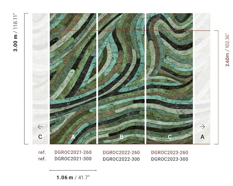 Let op: Deze mural bestaat uit 3 panelen. Deze panelen zijn ieder 3 meter hoog en 106 centimeter breed. Samengevoegd is de mural 3 meter hoog en 318 meter breed. Je maakt deze mural compleet door de 3 panelen met artikelcodes DGROC2021, DGROC2022 en DGROC2023 te bestellen (zie afbeelding).