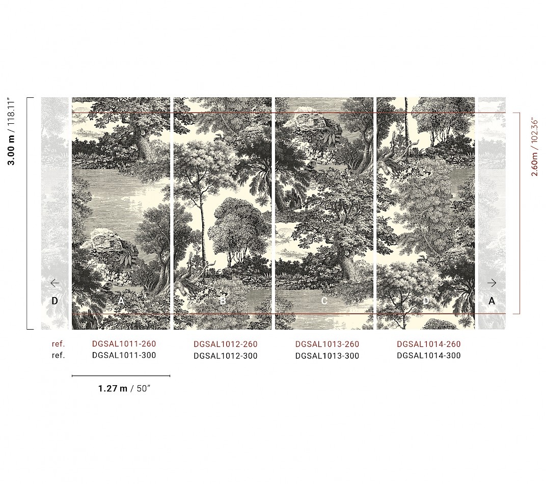Let op: Deze mural bestaat uit 4 panelen. Deze panelen zijn ieder 3 meter hoog en 127 centimeter breed. Samengevoegd is de mural 3 meter hoog en 5,08 meter breed. Je maakt deze mural compleet door de 4 panelen met artikelcodes DGSAL1011, DGSAL1012, DGSAL1013 en DGSAL1014 te bestellen (zie afbeelding).
