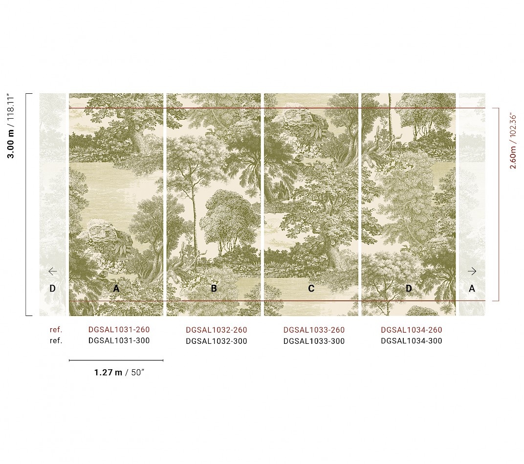 Let op: Deze mural bestaat uit 4 panelen. Deze panelen zijn ieder 3 meter hoog en 127 centimeter breed. Samengevoegd is de mural 3 meter hoog en 5,08 meter breed. Je maakt deze mural compleet door de 4 panelen met artikelcodes DGSAL1031, DGSAL1032, DGSAL1033 en DGSAL1034 te bestellen (zie afbeelding).