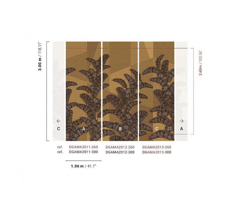 Let op: Deze mural bestaat uit 3 panelen. Deze panelen zijn ieder 3 meter hoog en 106 centimeter breed. Samengevoegd is de mural 3 meter hoog en 3,18 meter breed. Je maakt deze mural compleet door de 3 panelen met artikelcodes DGAMA2011, DGAMA2012 en DGAMA2013 te bestellen (zie afbeelding).