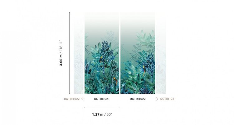Let op: Dit paneel bestaat uit 2 banen. Deze banen zijn ieder 3 meter hoog en 127 centimeter breed. Samengevoegd is het paneel dus 2 meter hoog en 254 centimeter breed. Je maakt deze mural compleet door de 2 panelen met artikelcodes DGTRI1021 en DGTRI1022 te bestellen (zie afbeelding).