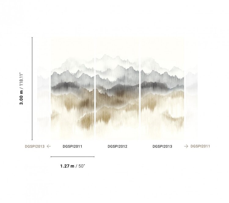 Let op: Dit paneel bestaat uit 3 banen. Deze banen zijn ieder 3 meter hoog en 127 centimeter breed. Samengevoegd is het paneel dus 3 meter hoog en 3,81 meter breed. Je maakt deze mural compleet door de 3 panelen met artikelcodes DGSPI2011, DGSPI2012 en DGSPI2013 te bestellen (zie afbeelding).