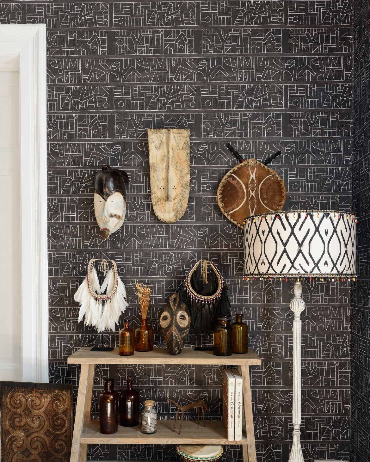 Mind the Gap Bushoong Kuba behang is een origineel tribaal dessin en stamt af van het Kuba volk. Zij staan bekend om hun met de hand geweven dessins op raffia doek. Dit patroon in tribale stijl is gemaakt met behulp van een origineel stuk Bushoong Kuba-doek, vooral om het originele onregelmatige uiterlijk van de handgeweven stof te bereiken.