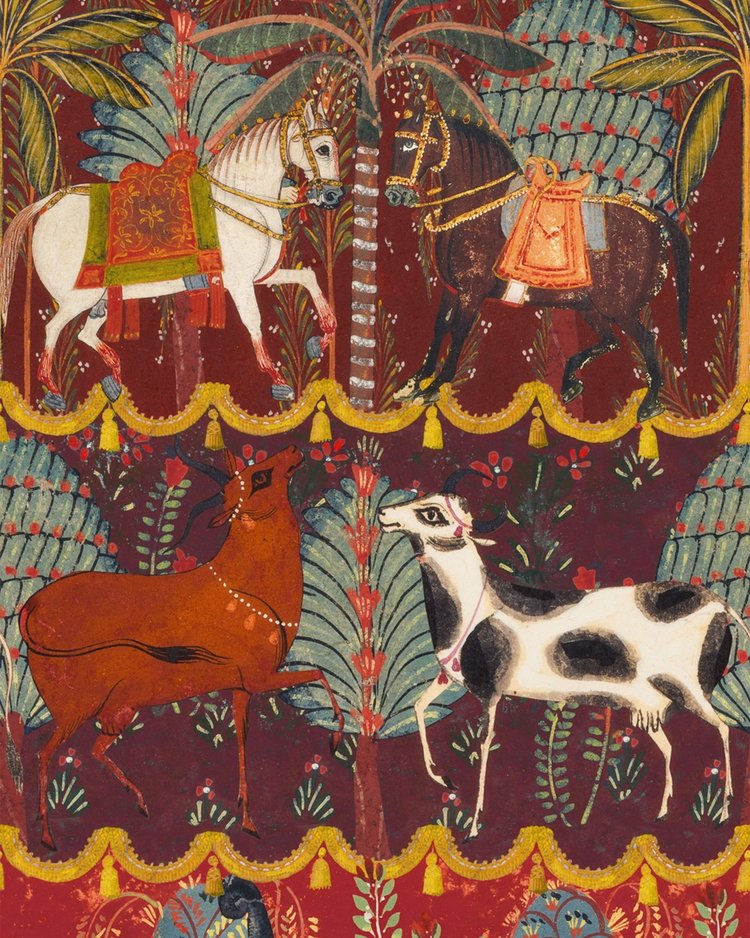 Carnaval paneelbehang. Omarm de caranaval-spirit met paarden, runderen en olifanten versierd met decoratieve guirlandes en geborduurde wandtapijten. Laat u meeslepen door exotisch gebladerte en levendige bloemen terwijl het geluid van muziek de lucht vult waarop zelfs de dieren dansen. De levendige kleurencombinaties brengen de prent tot leven, omzoomd door gouden guirlandes met kwastjes die het oog en de geest de overgang tussen de decors laten maken, waarbij u zich de verschillende geuren voorstelt die u omhullen, terwijl u door de magische tuinen van elke scène wandelt.