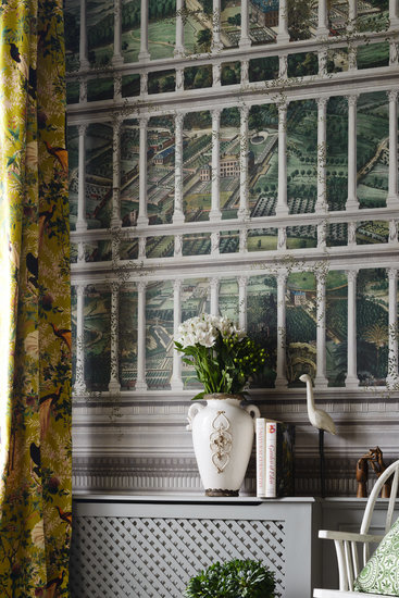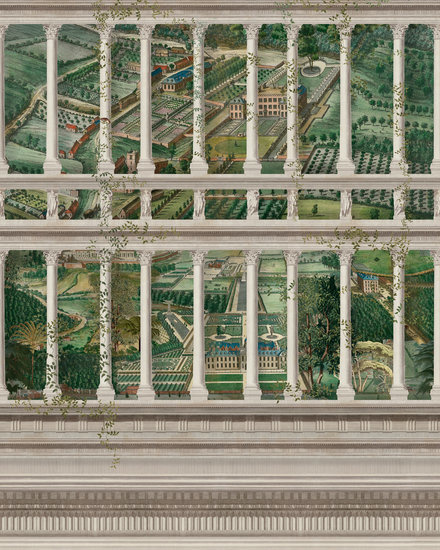 Mind the Gap Fairyland is een indrukwekkend behang met een geïllustreerd sprookjesachtig dessin. Een grootschalige behang met daarop architecturale kolommen en op de achtergrond een prachtig landschap op het platteland.