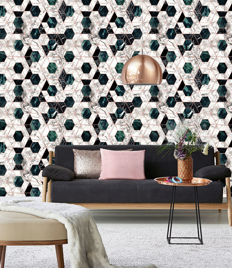 Hexa Jade Metallic behang. Een strak en eigentijds behang, met directe metallische banen en geometrische punten, voor een stijlvol interieur.