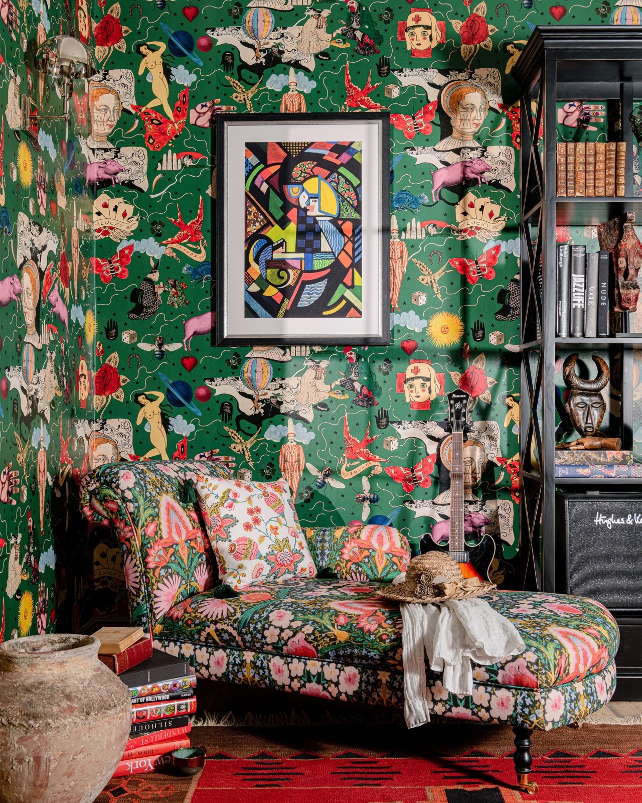 Illusionary Daytime paneelbehang. Laat je onderdompelen in een wereld van magie en optische illusies, waar de grenzen van de werkelijkheid vervagen. Laat je verbeelding je meenemen naar een andere wereld waar varkens vliegen, dieren spelletjes spelen en geluksamuletten voor het grijpen liggen. Boven de sterren, de wolken en het zonnestelsel. Een waar je naartoe kunt ontsnappen, uit de realiteit zoals je die kent. Een waar magie werkelijkheid is, je horizon verbreedt en je gevoel voor verwondering de overhand neemt in deze droomachtige sfeer tegen een blauwe en groene achtergrond.