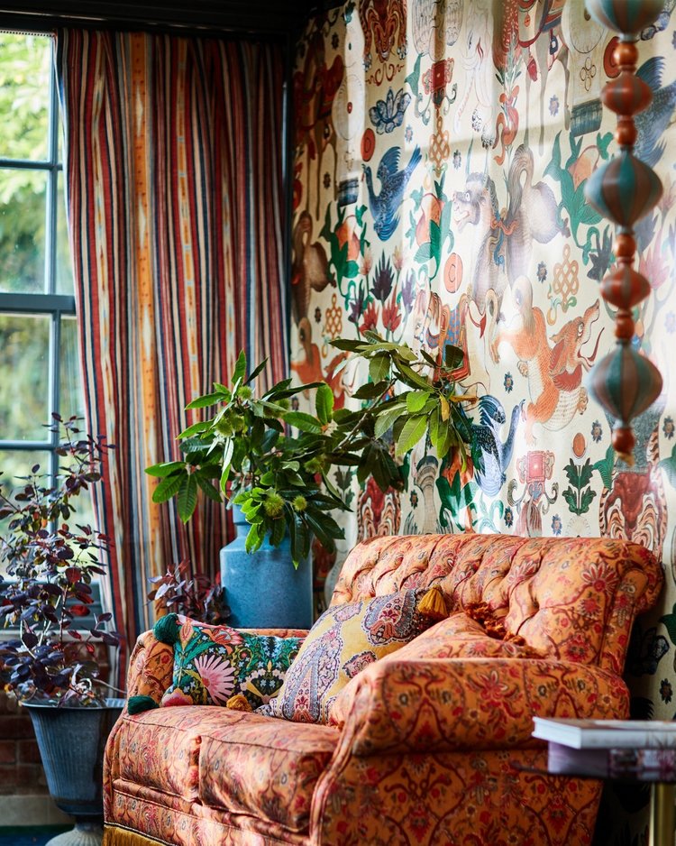 Incantation paneelbehang. Verwacht het onverwachte in de mystieke wereld waar wezens vrij rondlopen in een betoverende omgeving, blijf alert want je weet nooit wat er om de hoek ligt. Exotische vogels, versierde paarden en mythische draakachtige dieren zullen u omringen, terwijl u door tuinen dwaalt die gevuld zijn met opvallende flora en ingewikkelde architectonische figuren. Met achtergronden van crème, donkerblauw en geel opent deze levendige prent uw zintuigen terwijl u zich een rijke, aromatische geur voorstelt die door de lucht stroomt in dit fascinerende en betoverende domein.