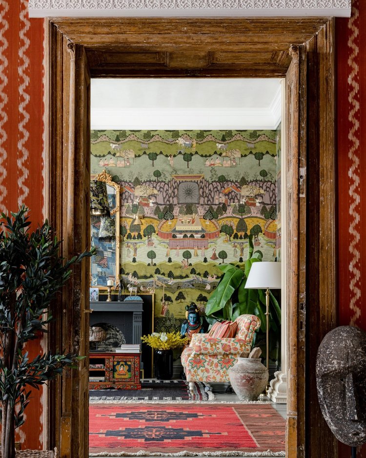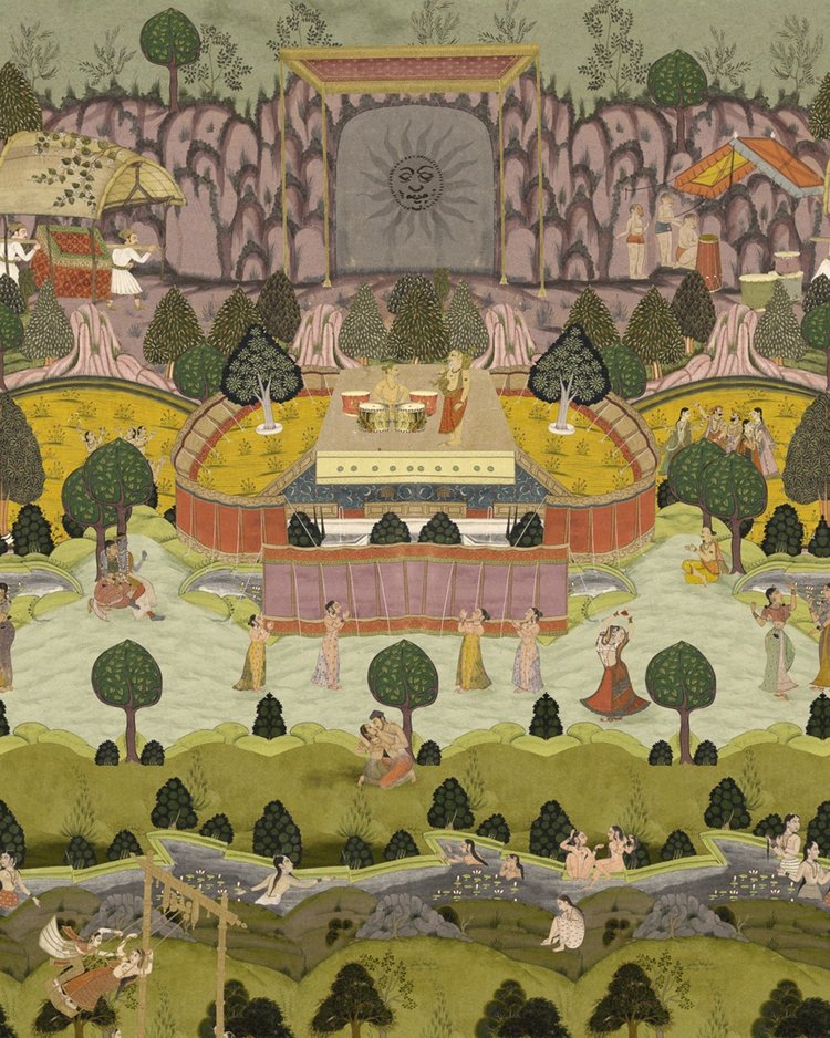 Peace and Music paneelbehang. Het geluid van muziek weerklinkt in de vallei als geliefden elkaar omhelzen en menigten eendrachtig samen dansen, te midden van tuinen vol bomen en verzorgde struiken. Festivalgangers zwemmen en dompelen zich onder in de natuur, terwijl de melodieën door de lucht blijven zweven in onze print. Fijne details tonen een omgeving die kalm en vol van geluk is, waar muziek werkt als een universele taal die iedereen samenbrengt als één. Terwijl uw ogen door de tuinen dwalen, vult het geluid van gelach en gesprekken uw geest en voert u mee naar het festival zelf, waar de tijd stilstaat en het huidige moment het enige is dat telt.