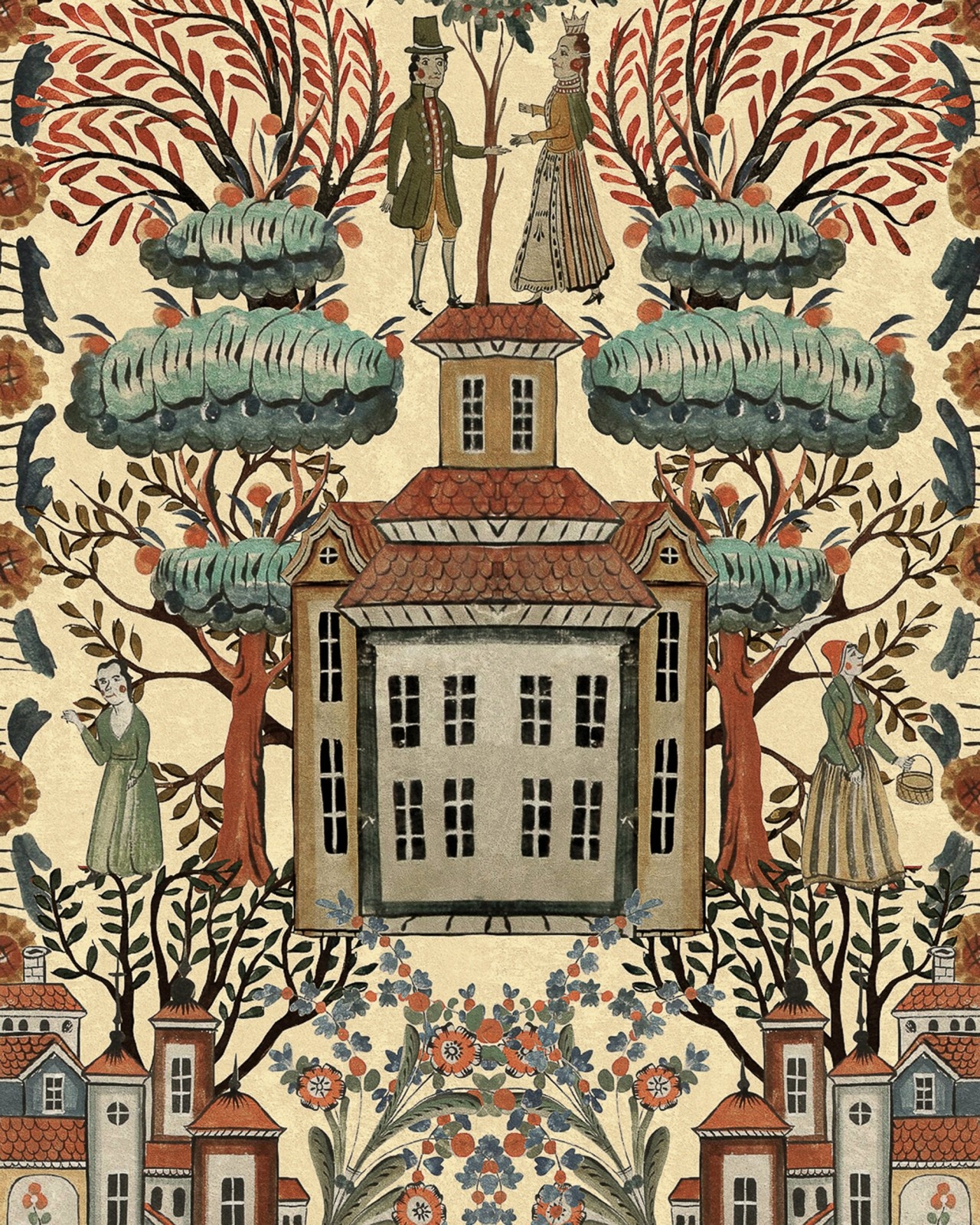 Tales of Tyrol is een behang dat geïnspireerd is op de haast magische architectuur en traditionele klederdracht van Tirol. Deze muurbekleding van Mind the Gap uit de Tyrol Apres-Ski collectie lijkt een winters sprookje, vol authentieke kostuums, beeldige bomen en bloemen en fantasierijke huizen. Een vintage behang dat perfect is voor een tijdloos, sfeervol en poëtisch interieur.