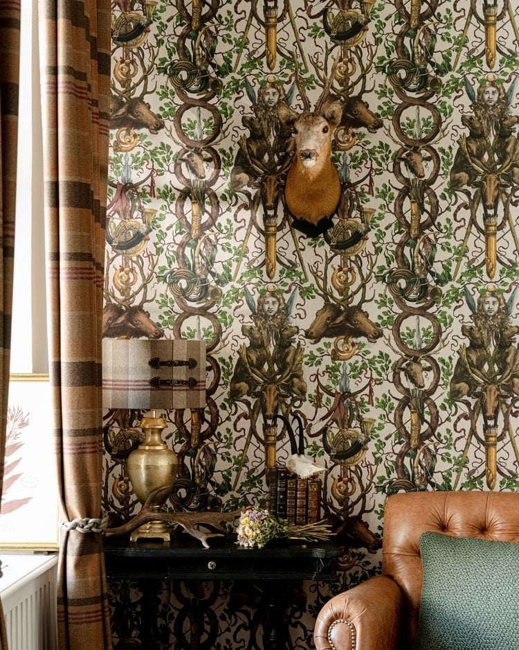The Ganghofer Hunt is een behang dat geïnspireerd is op de traditionele Alpse jachtsport, vol koperen hoorns en pijlkokers vol veren en rode linten. Deze muurbekleding van Mind the Gap uit de Tyrol Apres-Ski collectie heeft een gedurfd patroon met majestueuze herten en sterke berghonden. Een vintage behang dat perfect is voor een tijdloos, sfeervol en poëtisch interieur.