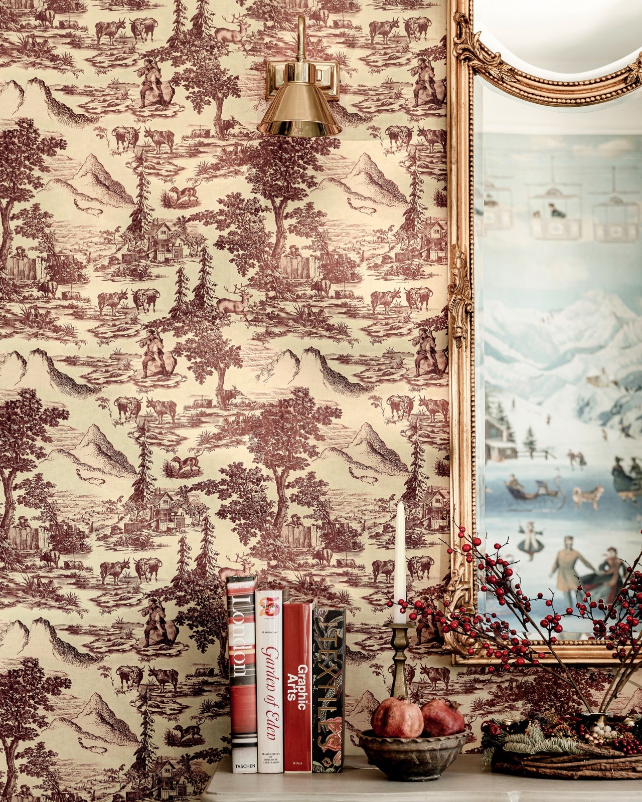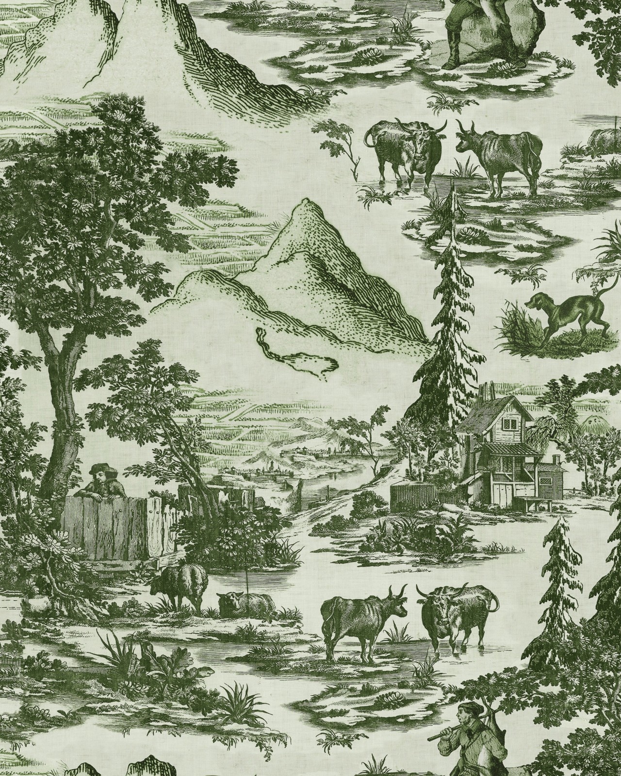 Alpine is een behang dat geïnspireerd is op het traditionele Franse Toile de Jouy behang of een klassiek chinoiserie. Deze muurbekleding van Mind the Gap uit de Tyrol Apres-Ski collectie neemt deze iconische inspiratiebronnen en steekt die in een Tirools jasje: een typisch berglandschap vol dennen, koeien en boeren. Een klassiek behang met een knipoog dat perfect is voor een tijdloos, warm en sfeervol interieur.