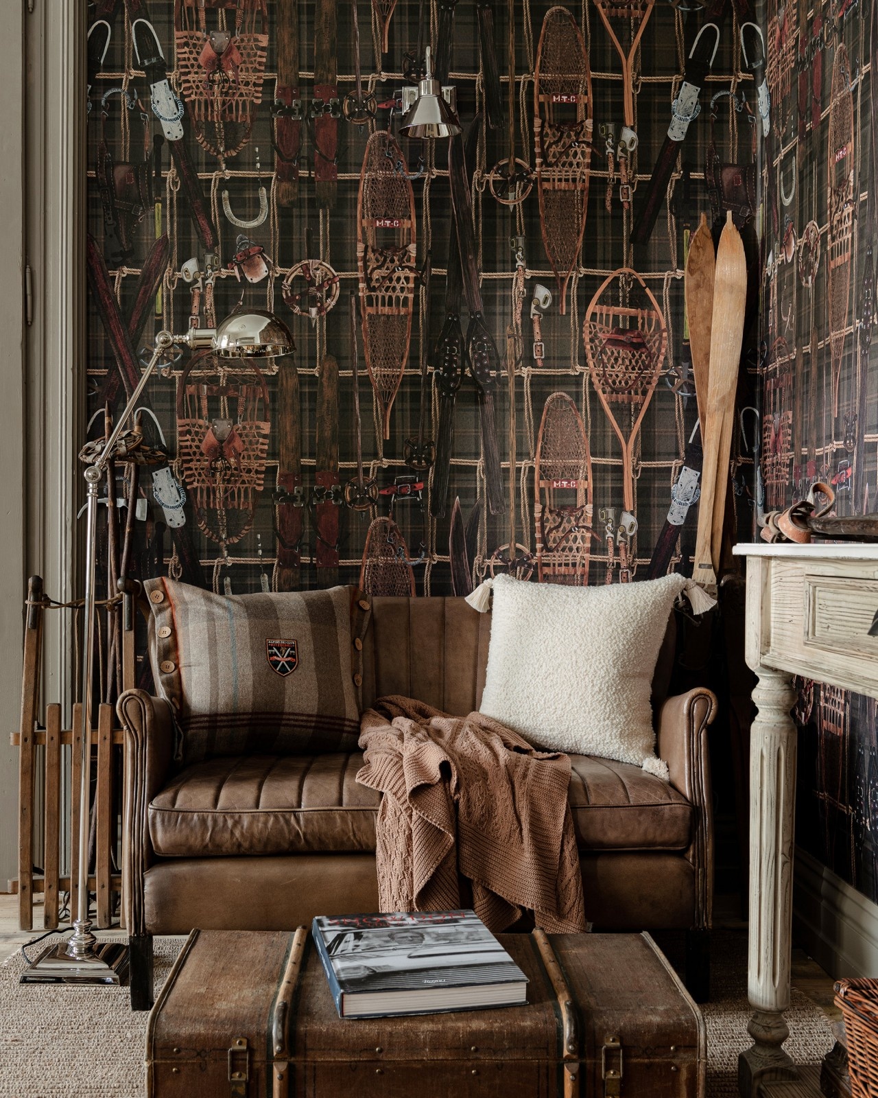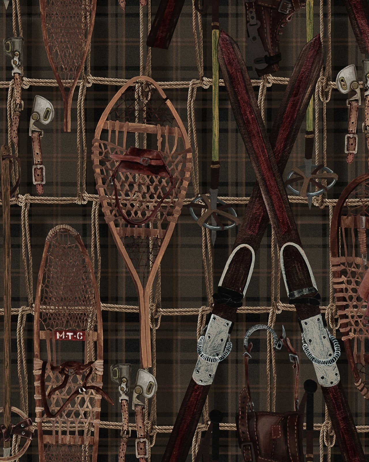 Vintage Skiing is een behang dat geïnspireerd is op authentieke winterse sportuitrusting, vol ski's sneeuwschoenen en antieke stokken. Deze muurbekleding van Mind the Gap uit de Tyrol Apres-Ski collectie toont een deze artikelen temidden van een traditioneel plaid en een vezelig touw. Een vintage behang dat perfect is voor een tijdloos, sfeervol en warm interieur.