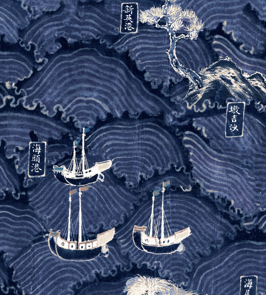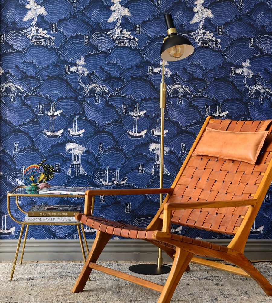 Waves Of Tsushima herschept het gevoel van een oud Japans houtsnededrukontwerp. Geïnspireerd door antieke kunstwerken gemaakt met deze traditionele methode, toont het behang denkbeeldige golven en boten in diepe indigotinten.