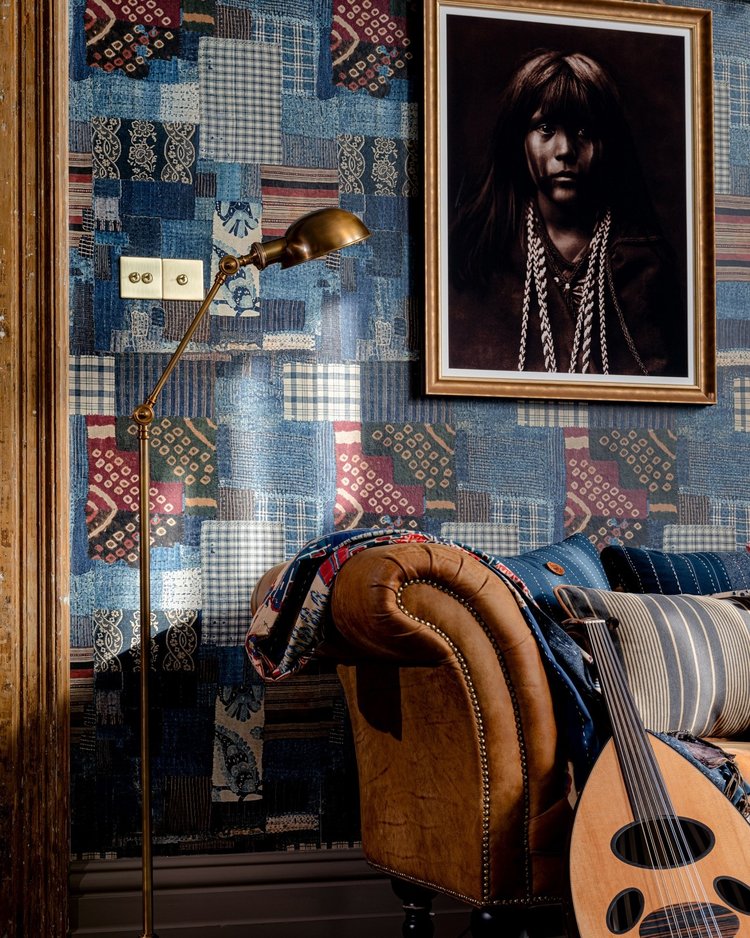 Woodstock Boro paneelbehang. Denim symboliseerde de opkomst van de tegencultuur met zijn ruwe afwerking en verscheidenheid aan toepassingen die verwijzen naar de kenmerken van de beweging zelf. Laat je betoveren door de herinneringen aan elke snit in de WOODSTOCK BORO print met verschillende patronen en materialen die een glimp opvangen van de mode en trends van die tijd. Deze lappendekencollage geeft een gevoel van materialiteit wanneer je je handen over de verschillende lagen en texturen laat glijden die, wanneer ze samen worden gelegd, de kamer vullen met een viscerale, maar stijlvolle achtergrond.