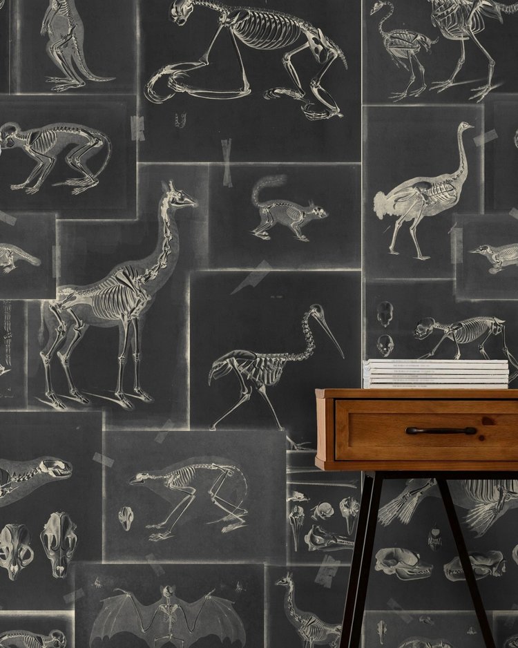 Het Zooarchaeology-behang is geïnspireerd op het levenswerk van een mysterieuze antiquair. Het ontwerp is gedrukt op 3 rollen.