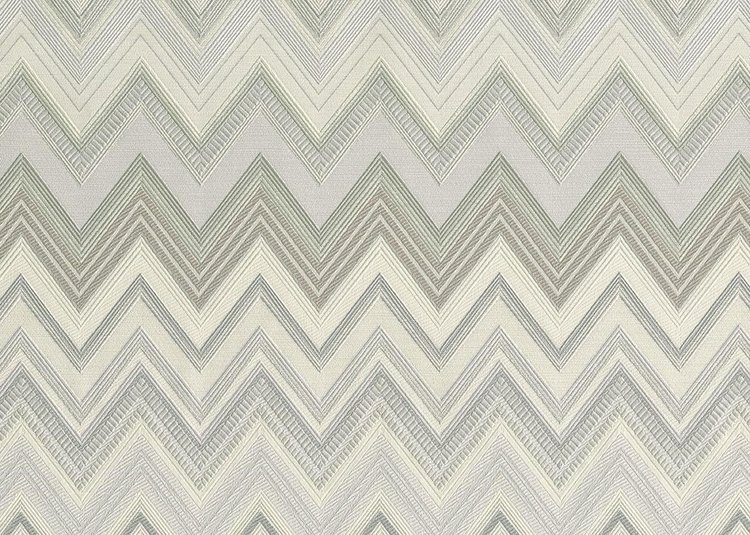 Happy Zig Zag, versterkt door het materiaaloppervlak dat door hot embossing is bewerkt, biedt het onmiskenbare ontwerp van de maxi-chevron in een palet van delicate groen-lila-okertinten, met een levendig of bijna fluisterend accent, of in het elegante blauwe ton-sur-ton versies, grijs, oker en wit