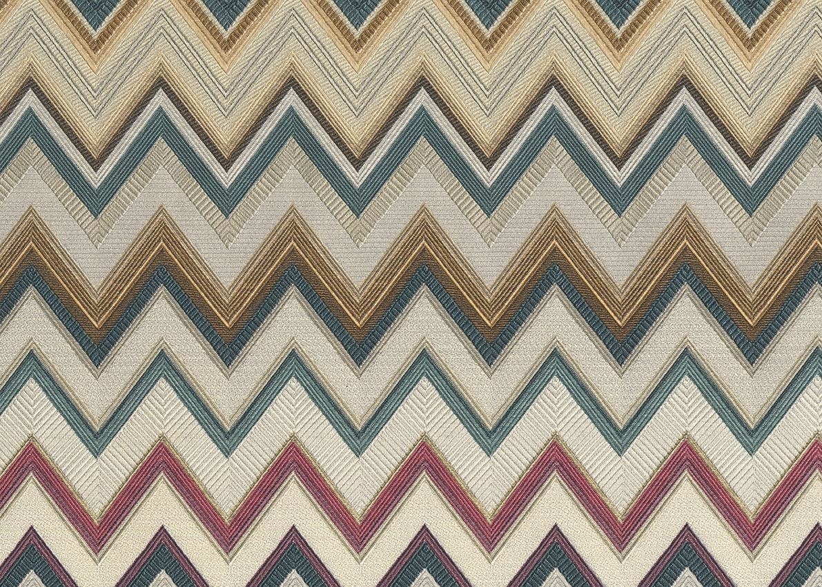 Happy Zig Zag, versterkt door het materiaaloppervlak dat door hot embossing is bewerkt, biedt het onmiskenbare ontwerp van de maxi-chevron in een palet van delicate groen-lila-okertinten, met een levendig of bijna fluisterend accent, of in het elegante blauwe ton-sur-ton versies, grijs, oker en wit