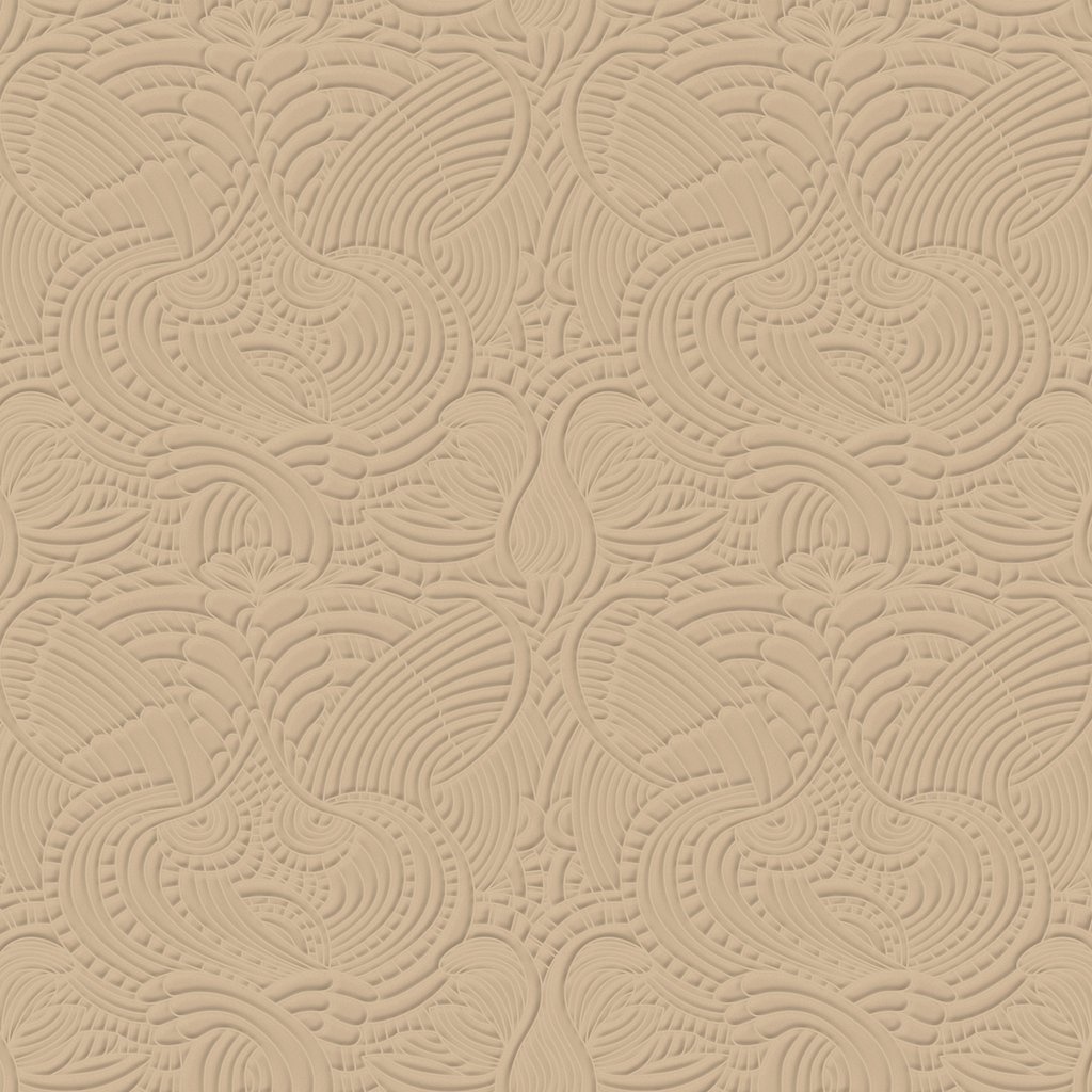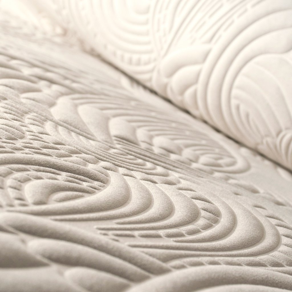 3D muurbekleding met de look van zacht suède, geïnspireerd door de natuurlijke outfit van de Dodo Pavone – een zachte pluimage van zilverkleurige veren met verschillende tinten van grijs, blauw, beige en wit.