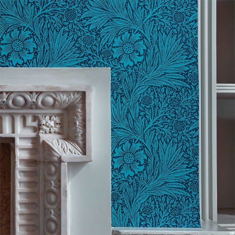 Marigold behang Morris & Co van William Morris is een prachtig behang met een patroon van bloemen (afrikaantjes) en bladeren. In een enkele kleur creëerde Morris prachtige patronen die goed functioneerden, zowel op behang als op stof stof. Een elegant veelzijdig behang met een blijvende aantrekkingskracht.