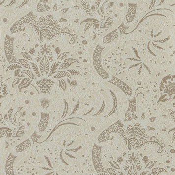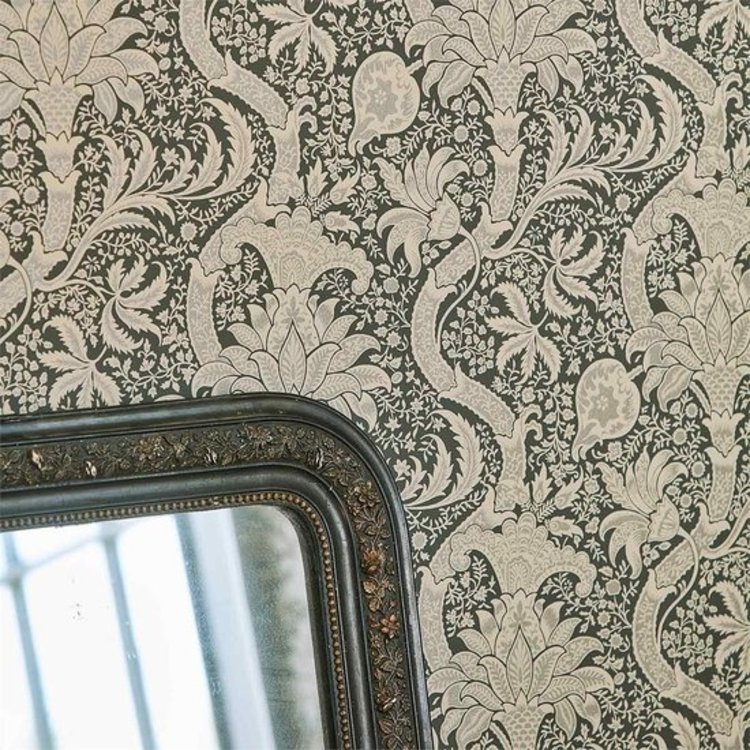 Indian behang Morris & Co van William Morris is ontworpen in 1868 door George Gilbert Scott. Een prachtig klassiek barok ontwerp. Zeer eigentijds door het kleurgebruik en metallic accenten. Oorspronkelijk werd dit gedrukt door een dubbelkleurig blok, de logboeken uit her archief van Morris & Co tonen aan dat het ontwerp zeer vaak opnieuw is gekleurd om tot de perfecte tint te komen.