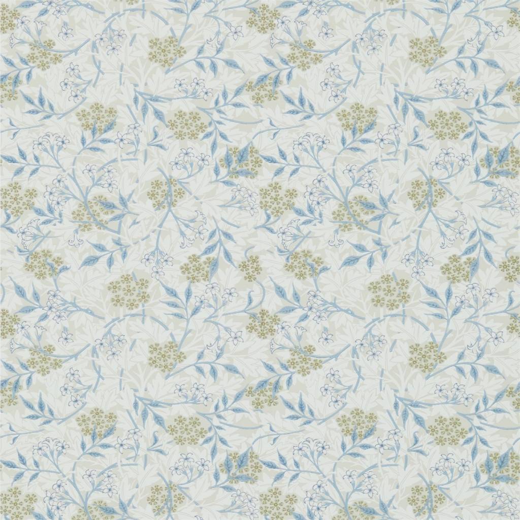 'Jasmine', ontworpen in 1872 door William Morris, heeft een all-over achtergrondpatroon van meidoornbladeren met bloemen en een kronkelend jasmijnpad over de bovenkant.