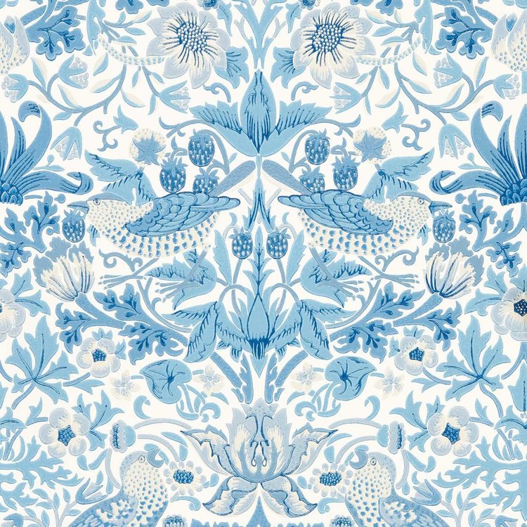 Simply Strawberry is een tijdloos behang dat geïnspireerd is op de zomerse tuinen op het platteland van Engeland. Deze muurbekleding van Morris & Co toont vogels die aardbeien plukken, temidden van een weelderig bloemenpatroon. Een botanisch behang dat perfect is voor een elegant, luxe en klassiek interieur.