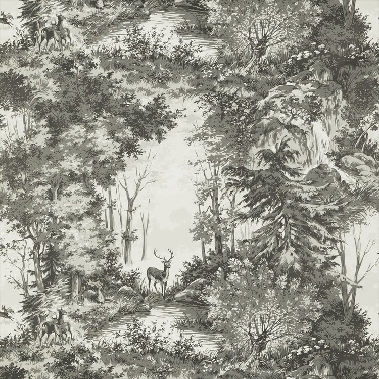 Torridon-behang toont een hert dat graast in een romantisch hooglandbos dat grafischer en moderner is geworden met zijn eigen modieuze kleurenpalet.