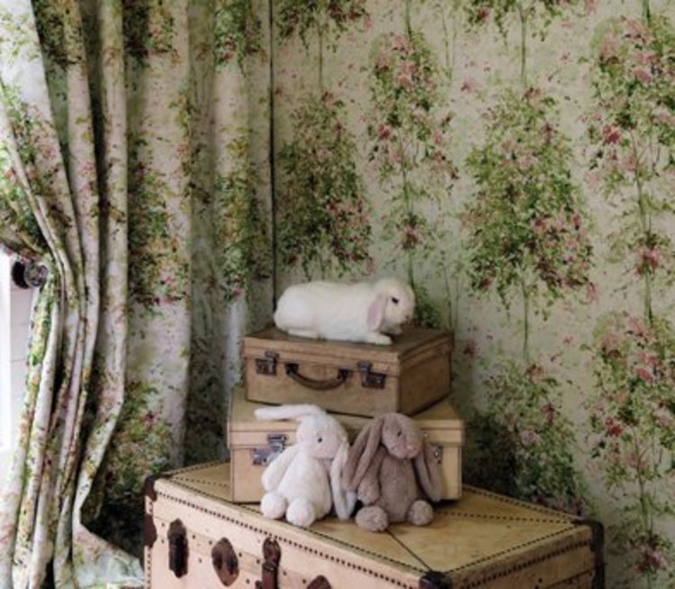 Behang uit de collectie Rosslyn van Nina Campbell. Patroon Lochwood (NCW4152-01) met bloem in kleur beige en multicolor.