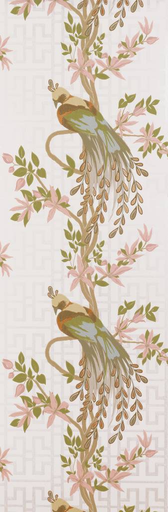 Behang uit de collectie Paradiso van Nina Campbell. Patroon Paradiso (NCW403005) met vogel en bloem in kleur zwart en groen.