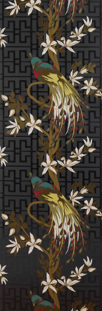 Behang uit de collectie Paradiso van Nina Campbell. Patroon Paradiso (NCW403005) met vogel en bloem in kleur zwart en groen.