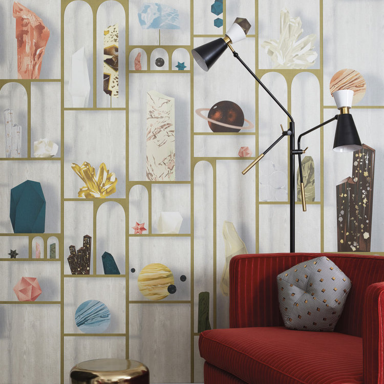 Nobilis vindt het rariteitenkabinet opnieuw uit: mineralen, planeten en gefantaseerde objecten in de planken van een denkbeeldige verzamelplank. Want elk element is uitzonderlijk en onverwacht vanwege het materiaal, de grootte en de kleuren. Eén rol is 4 druppels 27 1/2 inch x 130 inch, of een volledige panoramische 110 1/4 inch x 130 inch. Er zijn twee kasten beschikbaar: een met een aardewerk tegelachtergrond (Curiosités I) en een met een gebrand hout en messing plankachtergrond (Curiosités II).