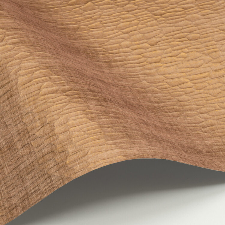 Gouge wandbekleding van Nobilis heeft een gestructureerd oppervlak dat lijkt op de bast van het waardevolle gutshout. Dit ontwerp maakt gebruik van warme tinten om een gastvrije sfeer in huis te creëren.