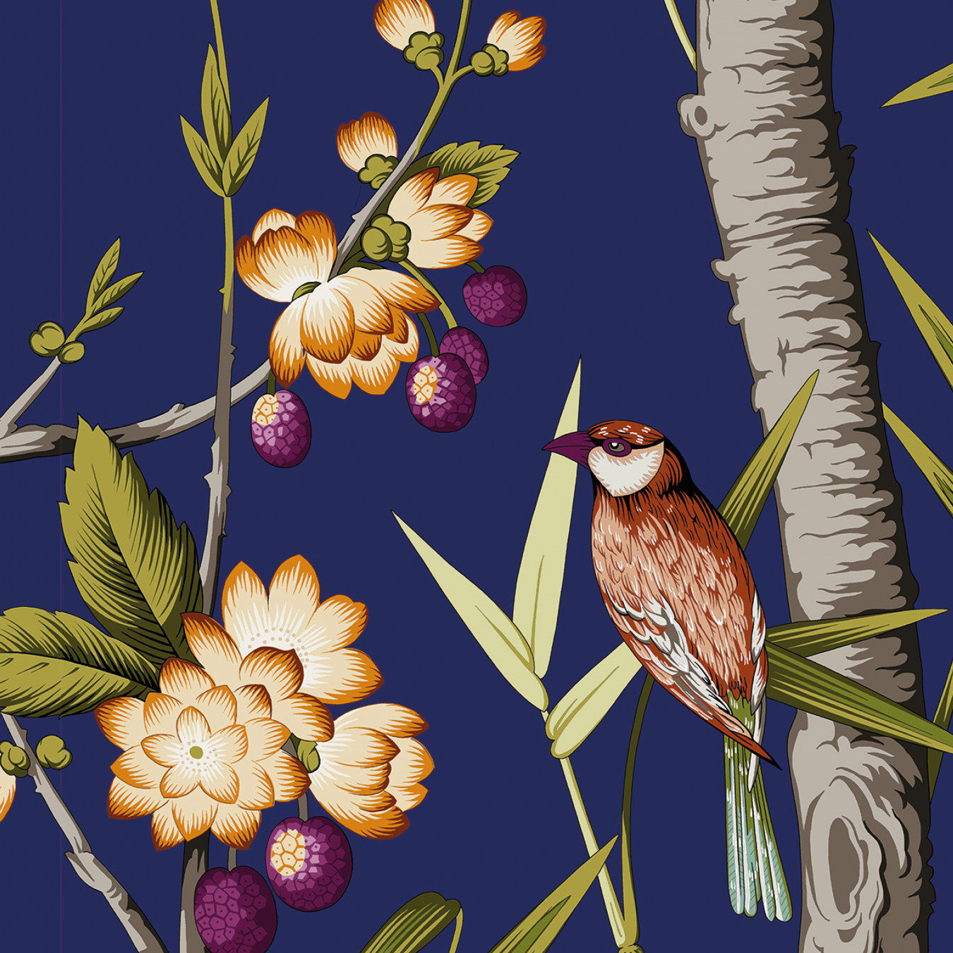 Met Joséphine herneemt Nobilis een groot klassiek behangontwerp met gedurfde en eigentijdse kleuren, gedrukt op Japans stro. Vogels met kleurrijk verenkleed rusten in de schaduw van bamboe en een boom met bloemen en exotisch fruit. Een rol is opgebouwd uit 2 stroken van 70 cm x 340 cm, dus een compleet panorama van 140 cm x 340 cm.